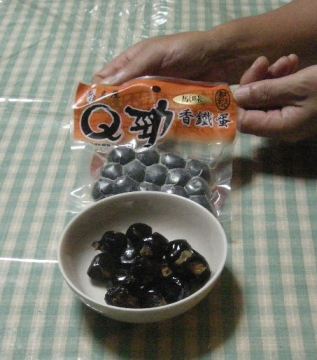 The picture on the left is called (probably) iron eggs There are two types, bigger one is usual eggs, and this one is quail's eggs. We boguht this bag of quail's iron eggs in Taiwan. It is one of local Taiwanese food.
